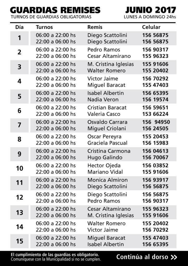 Desde que entró en vigencia la guardia del mes de junio se han llevado a cabo varias denuncias por no cumplir con el servicio preestablecido. La Municipalidad de Totoras puso a disposición de los ciudadanos los remisses que deben cumplir con horarios establecidos.