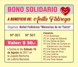 El sorteo será el día 19 de agosto en la jugada nocturna de Lotería Nacional. Los premios son: un acolchado, un juego de sábanas, una salida de baño, una orden de compra en autoservicio Las Lorenas, una pelota de fútbol, una caja de vinos, una linterna, una cartera de dama y una torta helada. Organiza: Ballet Folcklórico «Memorias de mi Tierra».