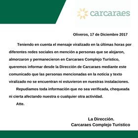 Rápidamente la información circuló por distintos puntos y ante los inminentes comentarios la empresa turística oliverense ofreció su comunicado en su página oficial: «Teniendo en cuenta el mensaje viralizado en las últimas horas por diferentes redes sociales en mención a personas que se alojaron, almorzaron y permanecieron en Carcaraes Complejo Turistico, queremos informar desde la Dirección de Carcaraes que mediante este comunicado que las personas no se encuentran ni estuvieron en nuestras instalaciones. Repudiamos toda información que no sea verificada, chequeada, ni cierta afectando nuestra o cualquier otra actividad».