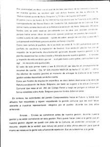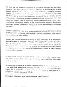 Por último, la anterior gestión expresó, en su defensa que «querer hacer creer a la gente que nos quedamos con plata de la comuna, es pretender consolidar un discurso alejado de la verdad que incluso es previo a esta última elección para que el mismo se instale en la gente a fuerza de repetición. Eso es subestimar a la gente». La verdad es la única que nos hace libres, a veces hay que esperar que el rio se aclare, escuchar a todos y después cada uno es libre de decidir qué futuro quiere para el pueblo. O buscamos juntos la verdad o la reemplazamos por el discurso», finalizó el escrito firmado por los miembros del partido «Comprometidos hacia el futuro».