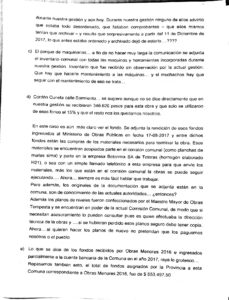 Otra de las cuestiones a aclarar se debe a la acusación en cuanto a que los fondos recibidos por Obras Menores 2016 e ingresados parcialmente a la cuenta bancaria de la comuna en el año 2017, lo cual, sostuvieron, «raya lo grotesco». El total de fondos asignados por la provincia a la comuna correspondiente a obras menores 2016 fue de $653.497,50.