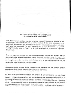 Por un lado, los panfletos fueron entregados junto a la última edición de tasas comunales, aunque sin firmas del emisor ni membrete comunal. En las mismas se dirigen hacia los vecinos detallando unas series de «sorpresas» con las cuales se encontró la actual comisión al mando de Osvaldo Rezzónico quien asumió la presidencia el pasado 10 de diciembre.