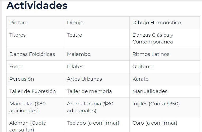 1 actividad $ 100 / 2 actividades $ 180 / 3 actividades $ 250
