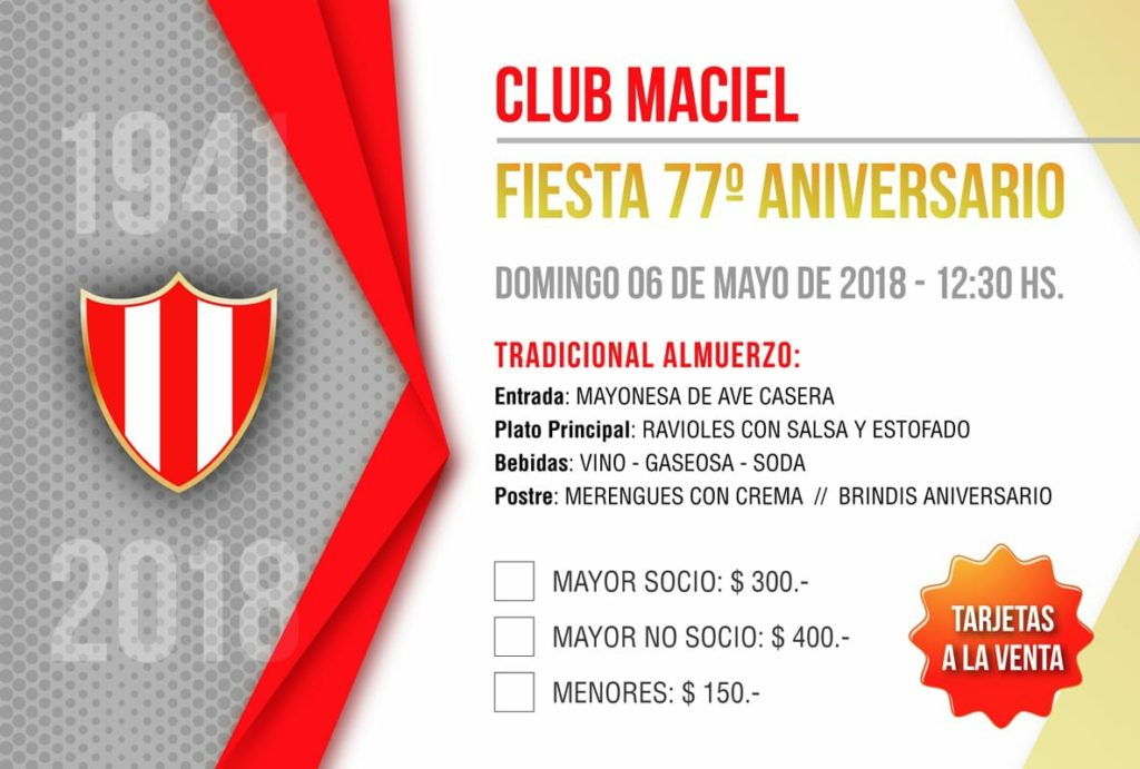 El próximo 2 de mayo la entidad deportiva Club Maciel cumplirá un nuevo año de vida desde su fundación, en 1941. El domingo 6 de mayo será el festejo con el tradicional almuerzo.