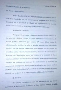 Si bien el presidente de la Comuna de Maciel no apuntó de forma directa contra ninguna persona durante la conferencia, en la denuncia oficial consta el nombre de la persona señalada en la justicia y se trata de una actual integrante de la comisión comunal y ex tesorera durante el gobierno de Jorge Marucco.