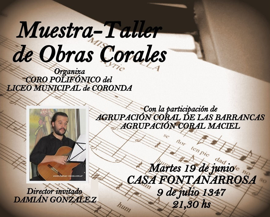 El taller contará con el encuentro de coros que lo tendrá al Director del coro de Maciel, Damián Gonzalez, como Director invitado. Será en casa Fontanarrosa, 9 de julio 1347, desde las 21.30.