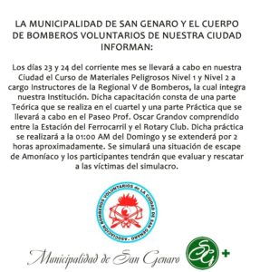 El próximo sábado 23 y el domingo 24 se llevará a cabo en la ciudad de San Genaro el Curso de Materiales Peligrosos Nivel 1 y 2 a cargo de Instructores de la Regional V de Bomberos, la cual integra la institución Sangenarina.