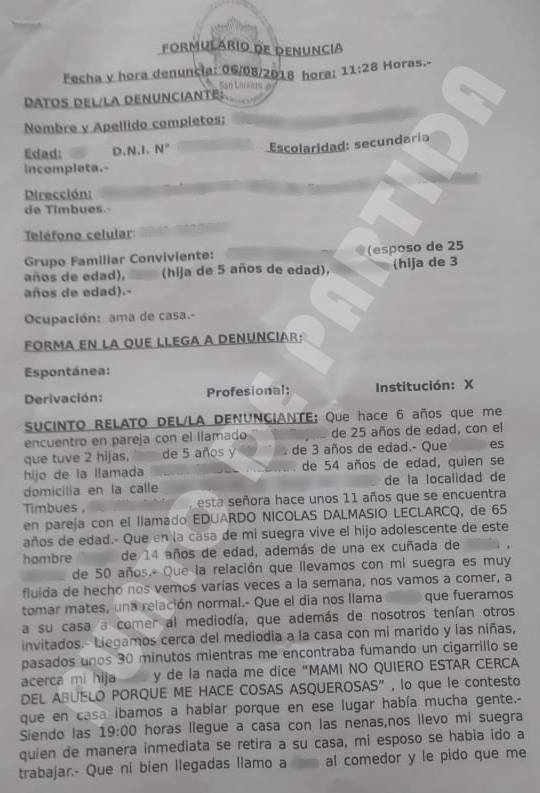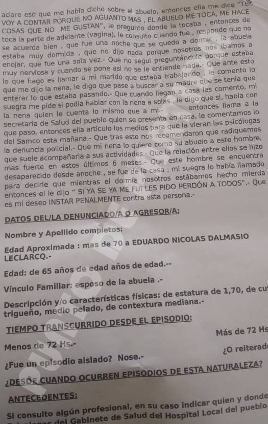 En medio de un familiar en la casa de los abuelos, la pequeña decidió declarar ante su madre lo ocurrido. «Mamá no quiero estar del abuelo (abuelastro) porque me hace cosas asquerosa», expresó la menor según consta en la denuncia.