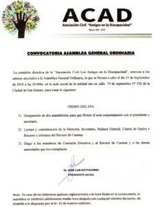 La Asociación Civil Amigos en la Discapacidad realizará su primera asamblea general ordinaria el próximo 25 de septiembre e invita a toda la población a formar parte.