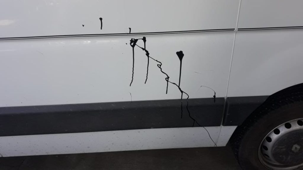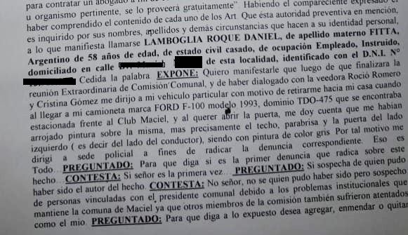 «Quiero manifestar que luego de que finalizara la reunión Extraordinaria de Comisión Comunal y de haber dialogado con la veedora Rocio Romero y Cristina Gomez, me dirijo a mi vehículo particular con motivo de retirarme hacia mi casa cuando al llegar a mi camioneta marca FORD F-100 modelo 1993 que se encontraba estacionada frente al Club Maciel, y al querer abrir la puerta me doy cuenta que me habían arrojado pintura sobre la misma, más precisamente el techo, parabrisa y la puerta del lado izquierdo, siendo con pintura de color gris».