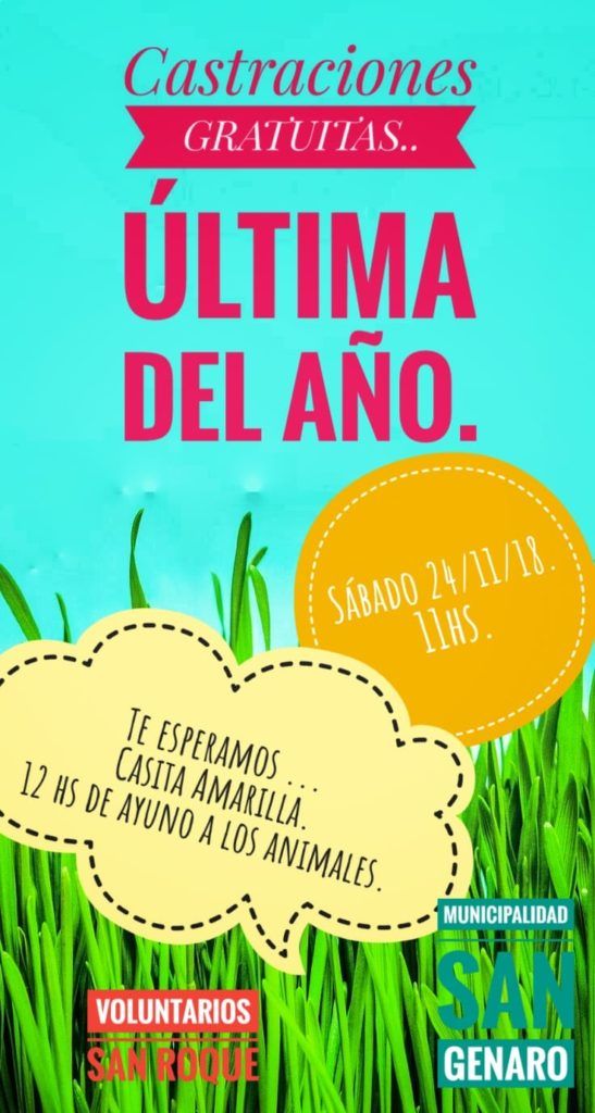 Por el lado de San Genaro será a desde las 11 horas, en el Predio de la Unión (zona de semáforos, casa amarilla). Será la última jornada de castración del año en la ciudad.