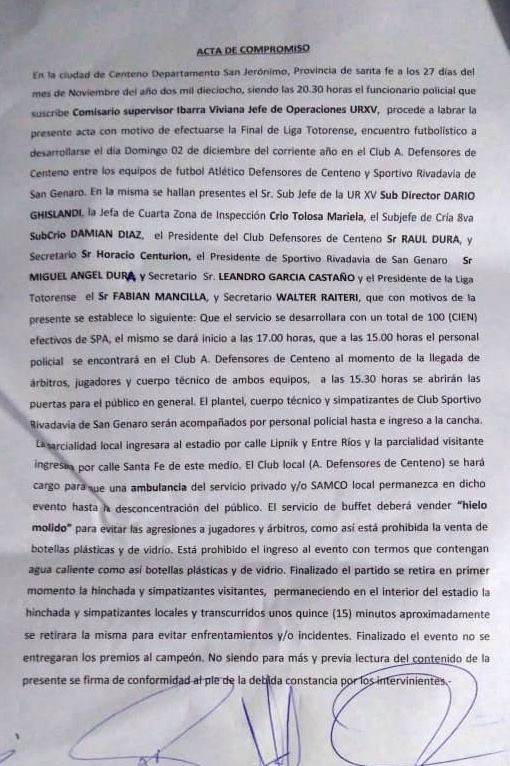 Este martes por la noche se llevó a cabo una reunión en la cual se redactó y firmó el acta de compromiso de cara a la segunda final de la Liga Totorense a disputarse el próximo domingo 2 de diciembre en Centeno entre Defensores y Sportivo San Genaro.