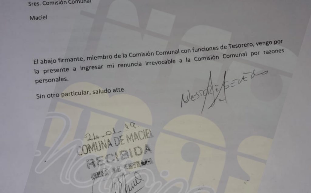 La renuncia de Severo, según manifiestan desde la comuna y consta en la copia que aquí se muestra en exclusiva, se recibió por mesa de entrada el pasado 24 de enero de 2019 y fue aceptada en la última reunión de comisión, votando Tobozo y la vicepresidenta Patricia Bessonart.