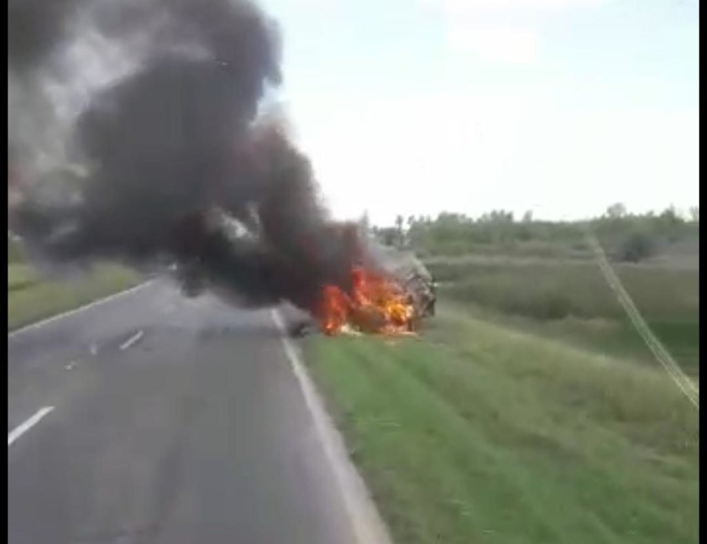 El auto quedó totalmente destruido en la banquina y durante varios minutos la ruta permaneció cortada por precaución. Los Bomberos voluntarios de Centeno trabajaron para sofocar el fuego.