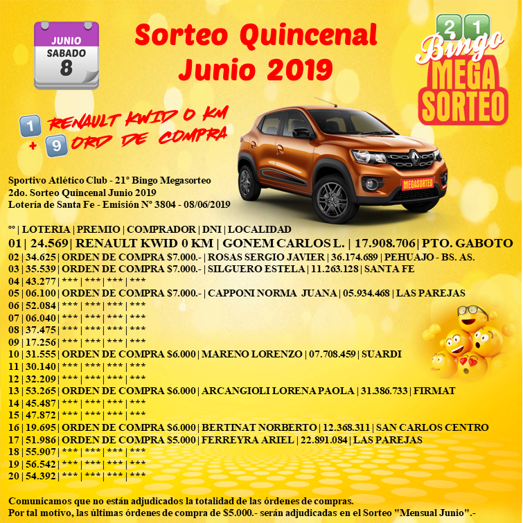 El pasado sábado 8 de junio se realizó el Sorteo Quincenal «Junio 2019» del 21° Bingo Megasorteo. Como ganador resultó un hombre oriundo de la localidad de Puerto Gaboto.