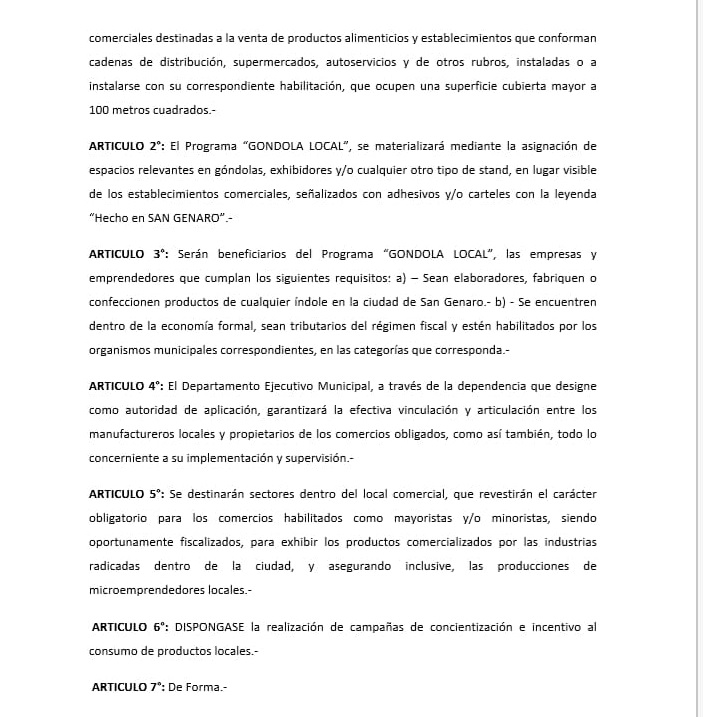 Además el programa «Góndola local» se materializará mediante la utilización de espacios relevantes en góndolas o exhibidores de los establecimientos comerciales, señalizados con adhesivos que indiquen la leyenda «Hechos en San Genaro».