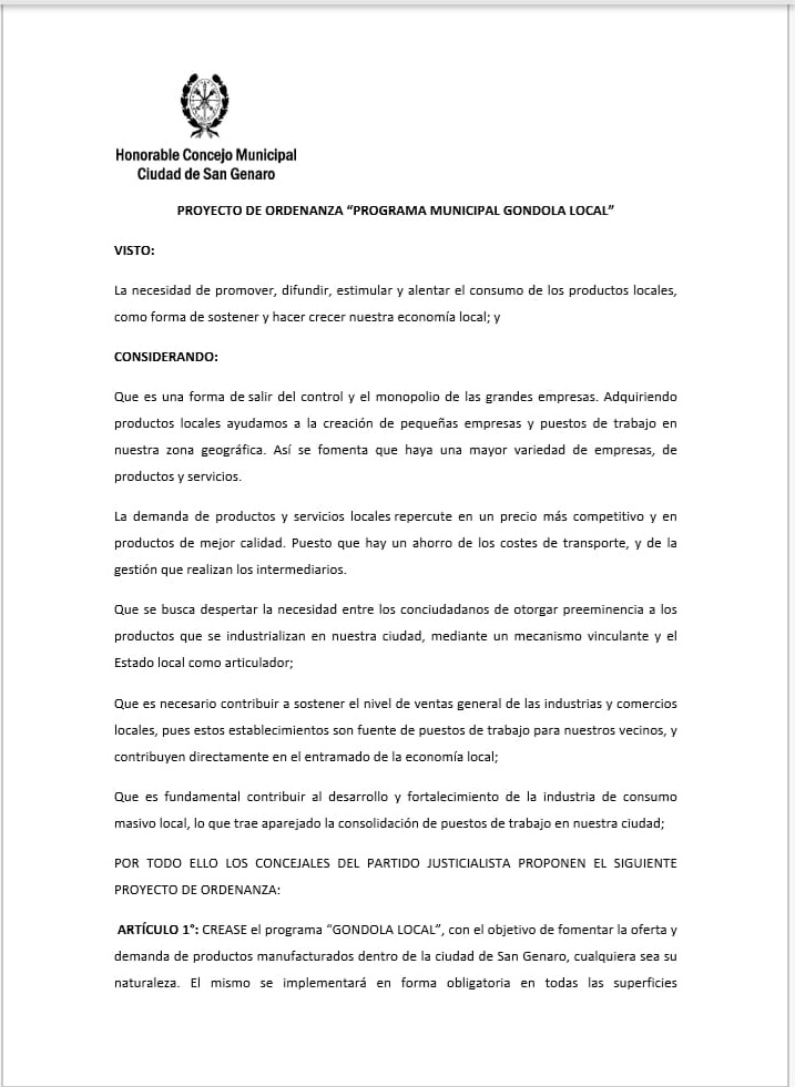 En la sesión de este jueves, los ediles aprobaron el proyecto para la creación del programa «Góndola Local» en la ciudad de San Genaro. Fue presentado por los concejales que integran el Bloque Justicialista dentro del cuerpo legislativo y votado por unanimidad.