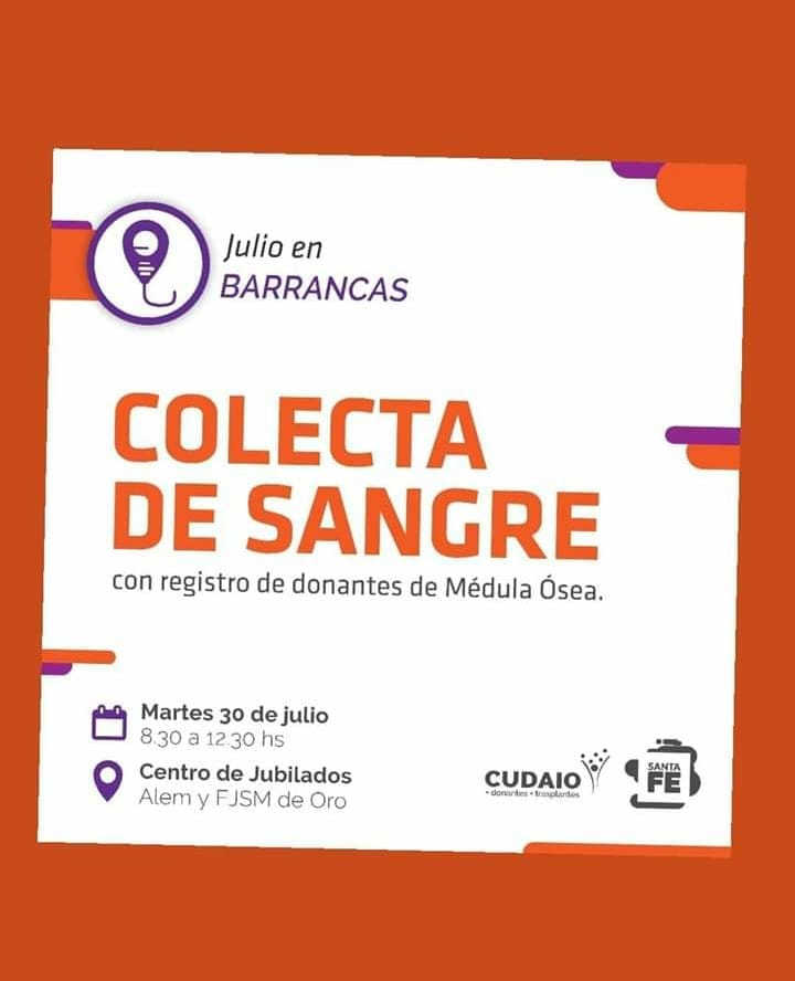 Antes de que finalice el mes de julio, desde la localidad de Barrancas se realizará una nueva jornada de donación de sangre con registro de médula ósea.