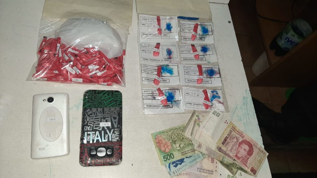 En su interior se hallaron 100 envoltorios de color rojo, sellado en sus puntas, con una sustancia pulverulenta. Tras la consulta, la brigada operativa antinarcóticos XVII, dependiente de la Dirección Narco criminalidad, informó que se trataba de cocaína, con un porcentaje total aprox de 61 gramos.