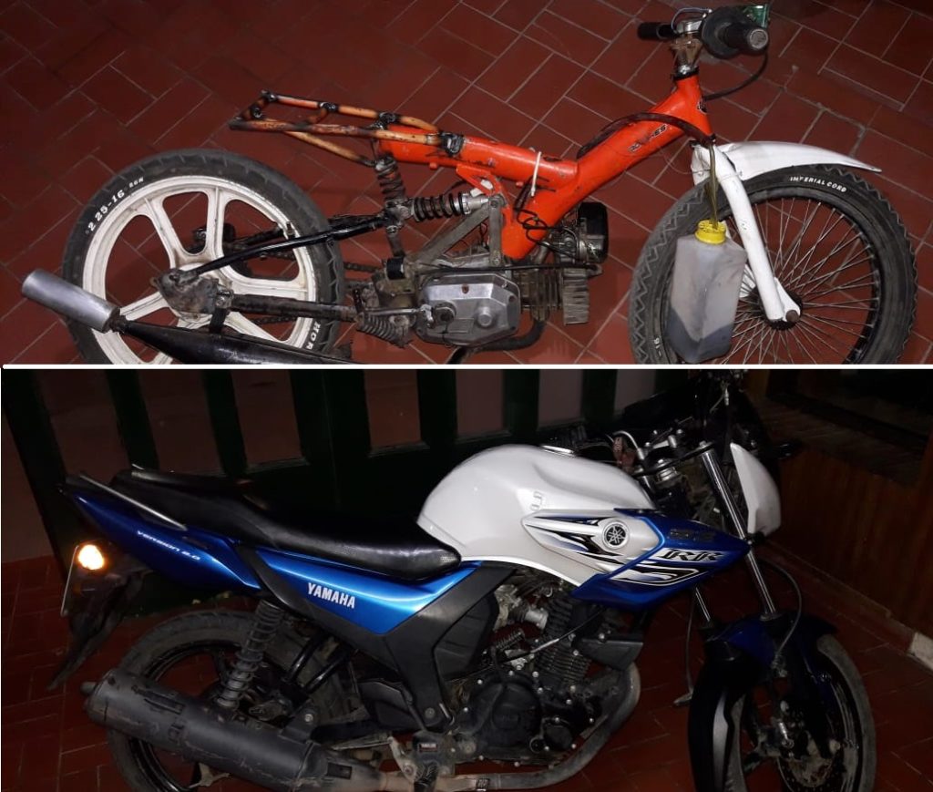 Uno de los rodados es una Yamaha de alta cilindrada de color azul y el otro es una motocicleta armada de manera rústica, tal es así que el tanque de combustible no es más que un bidón de plástico.