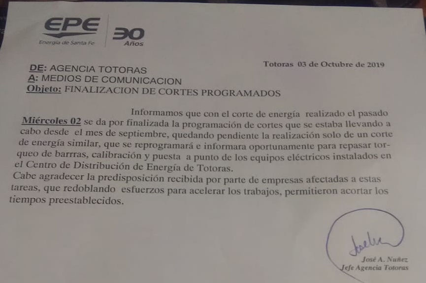 Este jueves, la Empresa Provincial de la Energía con sede en Totoras, dio a conocer un comunicado en el cual confirmó que este miércoles 2 finalizaron los cortes que estaban programados en la ciudad.