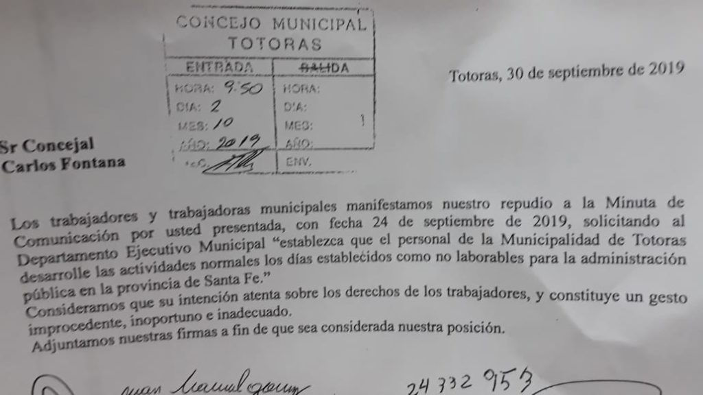 En la sesión del Concejo Municipal de Totoras llevada a cabo el pasado jueves 26 de septiembre, el concejal Carlos Fontana presentó un proyecto para que los municipales trabajen los días no laborables. Los empleados locales emitieron un comunicado en repudio a la minuta de comunicación.
