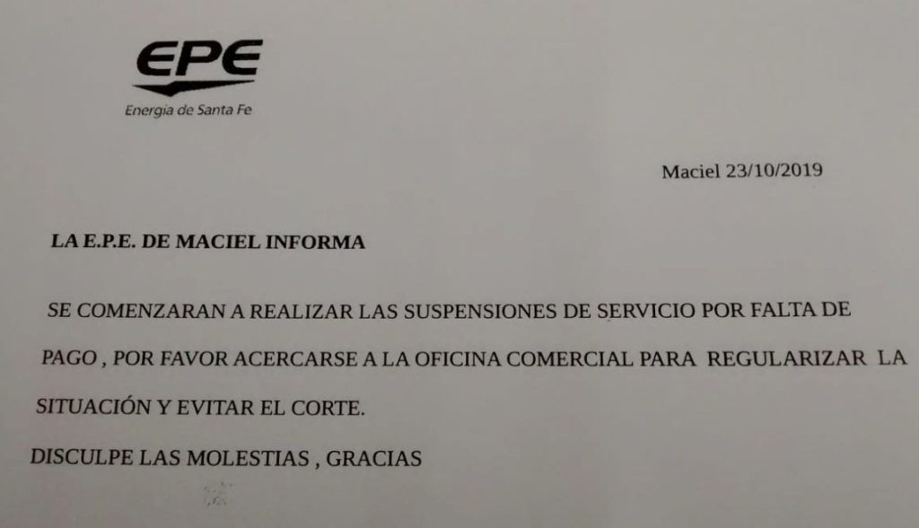 El comunicado oficial expresa: «La EPE de Maciel informa que se comenzarán a realizar las suspensiones de servicio por falta de pago. Por favor acercarse a la oficina comercial para regularizar la situación y evitar el corte».