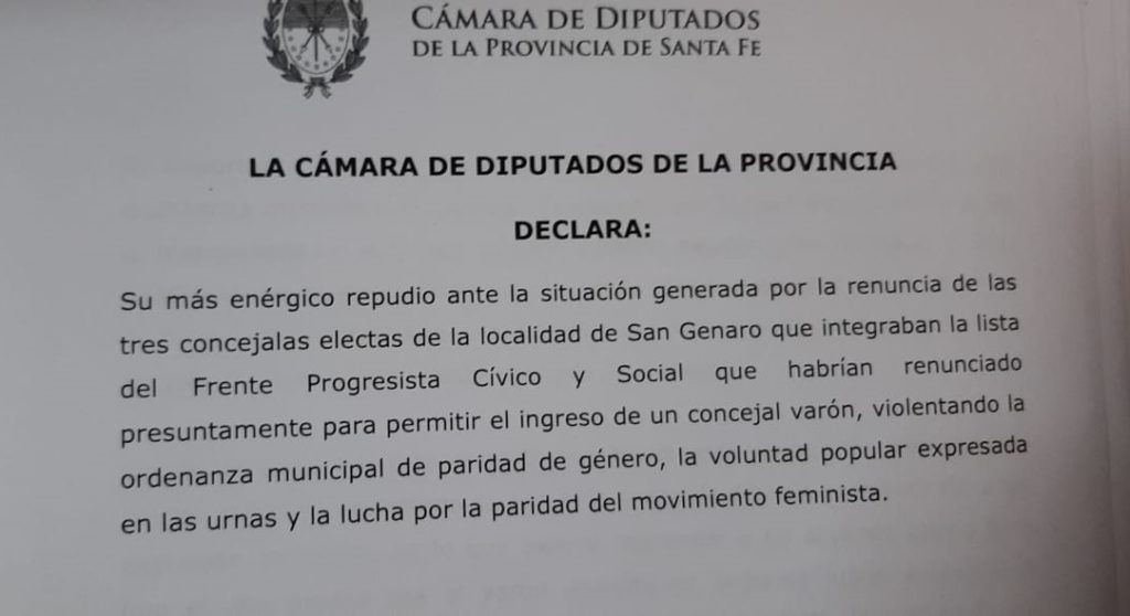 A partir de los hechos ocurridos en San Genaro, donde tres concejalas renunciaron a su banca para que pueda asumir el segundo de la lista de concejales del Frente Progresista, las críticas superaron los límites de la localidad y la Cámara de Diputados aprobó una resolución de repudio.
