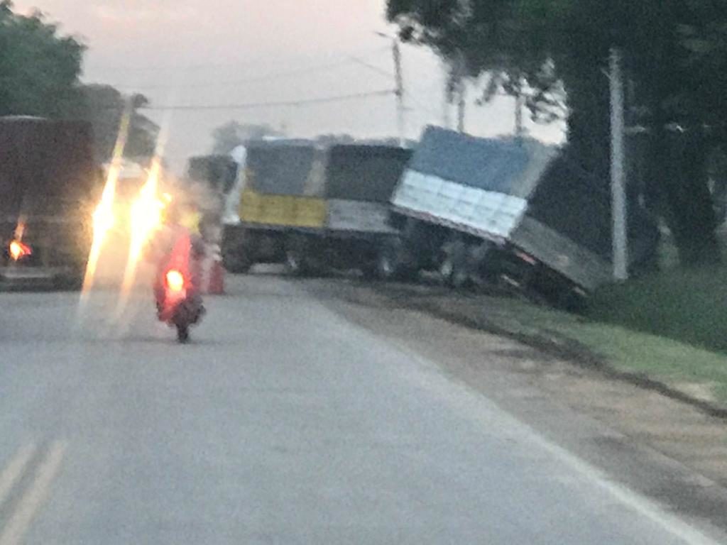 Allí un camionero realizó una mala maniobra y terminó volcando su acomplado en la cuneta. Afortunadamente el chofer no resultó herido.