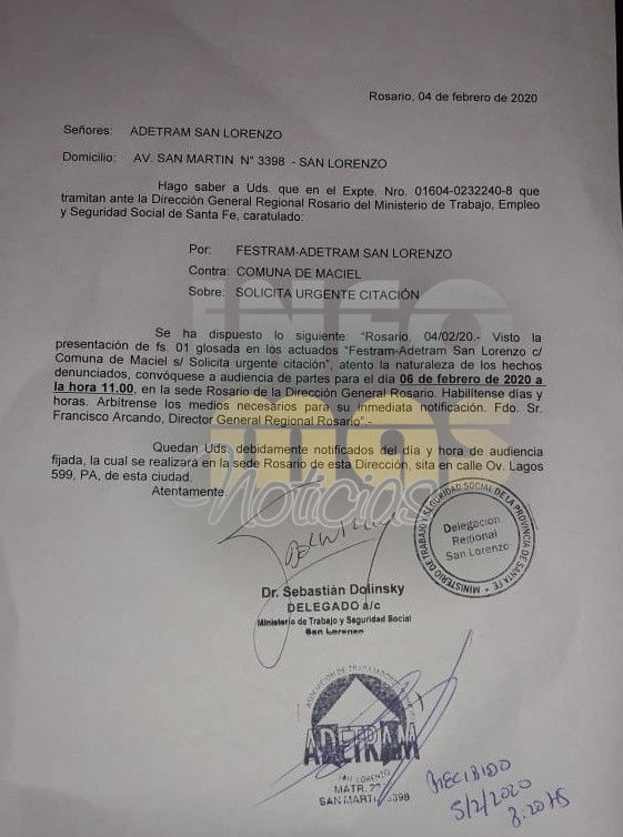 En medio del paro de trabajadores comunales de Maciel que este jueves cumplirá una semana, el Ministerio de Trabajo envió una citación para llevar a cabo una reunión en Rosario.