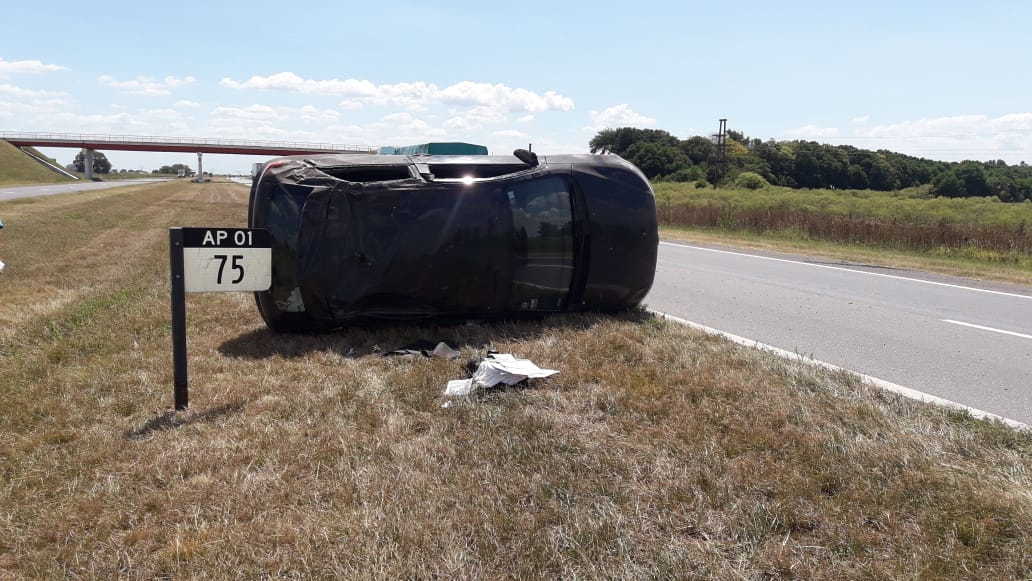 Ocurrió a la altura del kilómetro 75 de la traza, minutos después de las 13 horas, cuando un automóvil Volkswagen Trend de color negro despistó y dio varios tumbos, quedando recostado sobre su lateral al borde del cantero central.