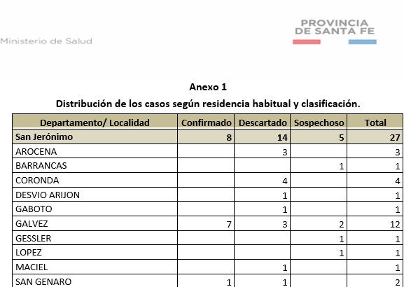 Un nuevo informe oficial emitido en la noche de este jueves por el Ministerio de Salud de la Provincia de Santa Fe indicó que hay un paciente como caso sospechoso de coronavirus en la localidad de Barrancas.