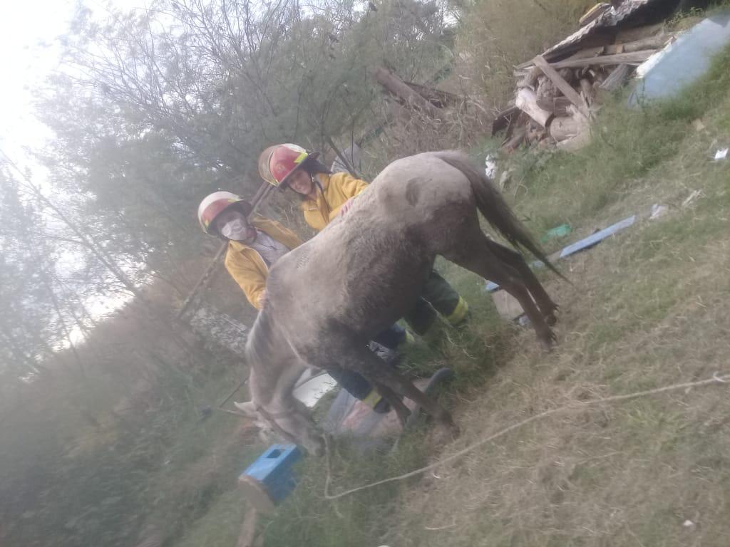 Un caballo cayó a un canal y quedó enredado en su propia soga en medio del agua y el barro. Bomberos Voluntarios no dudaron en rescatarlo y ponerlo a salvo.