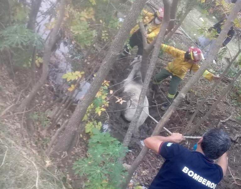 Un caballo cayó a un canal y quedó enredado en su propia soga en medio del agua y el barro. Bomberos Voluntarios no dudaron en rescatarlo y ponerlo a salvo.