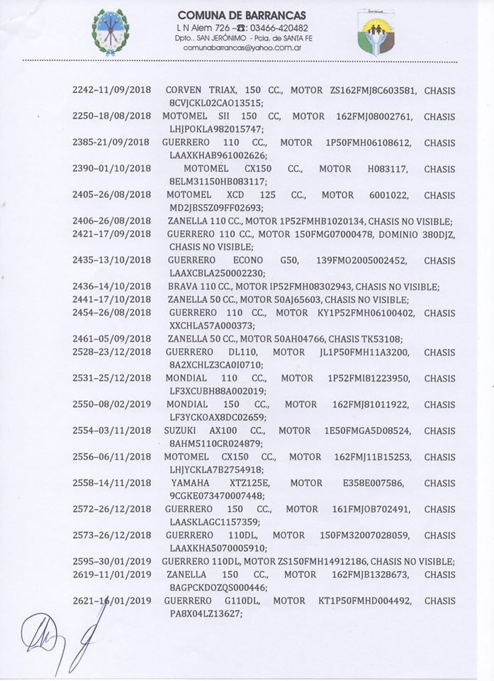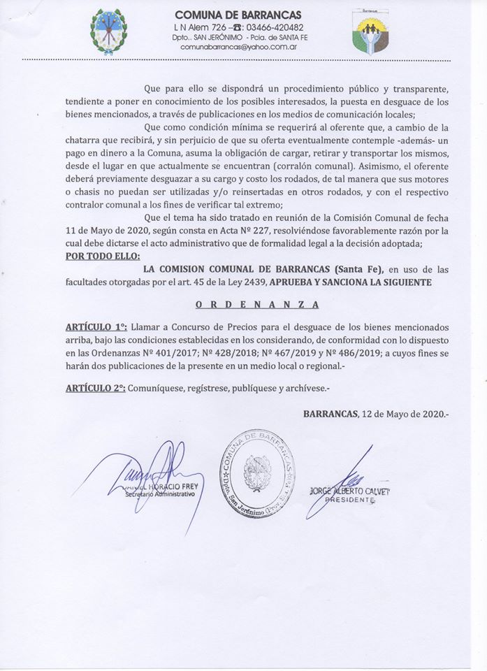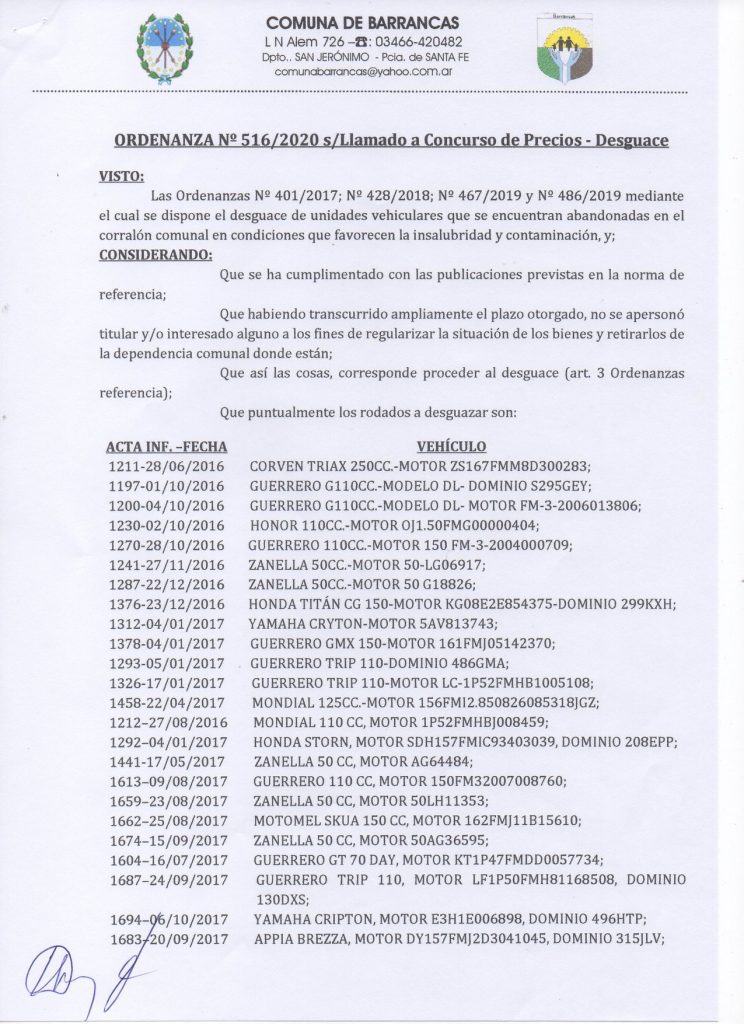 A través de las ordenanzas correspondientes, se dispuso el desguace de unidades vehiculares que se encuentren abandonadas en el corralón de la comuna de Barrancas. Para ello, se llama a un concurso de precios. Vale aclarar que no se trata de un remate.