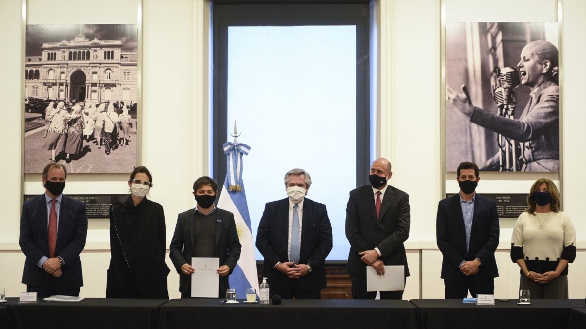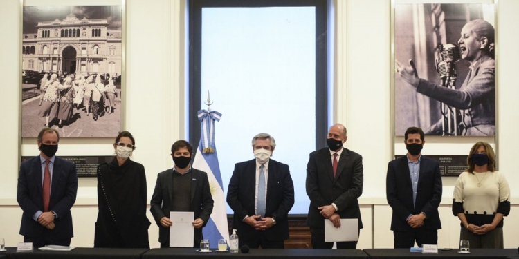Del evento, que se desarrolló en la Casa Rosada, participaron también el ministro del Interior, Eduardo de Pedro; los gobernadores de Buenos Aires y Entre Rios, Axel Kiciloff y Gustavo Bordet; y la ministra de Infraestructura, Servicios Públicos y Hábitat, Silvina Frana.