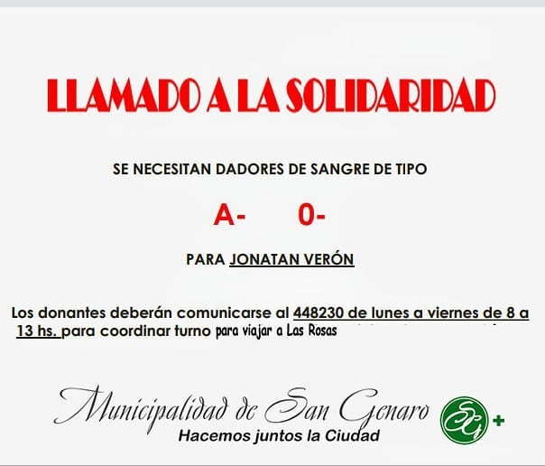 Mediante un comunicado que lanzó la Municipalidad de San Genaro, solicitan dadores de sangre para el joven accidentado el pasado miércoles en la ciudad.