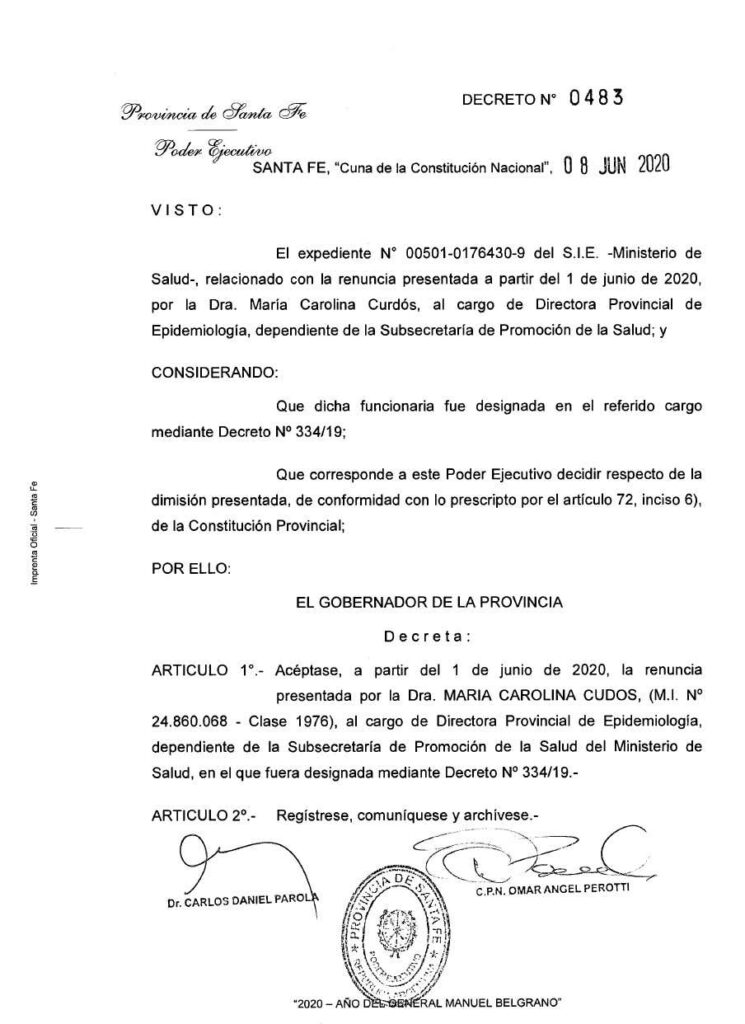 Si bien la fecha del decreto 0483 es del lunes 8 de junio, la noticia se dio a conocer en la mañana de este miércoles. Por el momento, no se confirmó quien será su reemplazante.