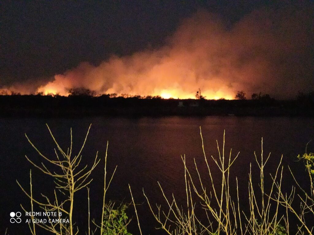 Un impresionante incendio se registra en la zona de islas frente a Puerto Gaboto. Se trata de un gran foco de llamas que consume los pastizales y hay temor por los animales que allí se encuentran.