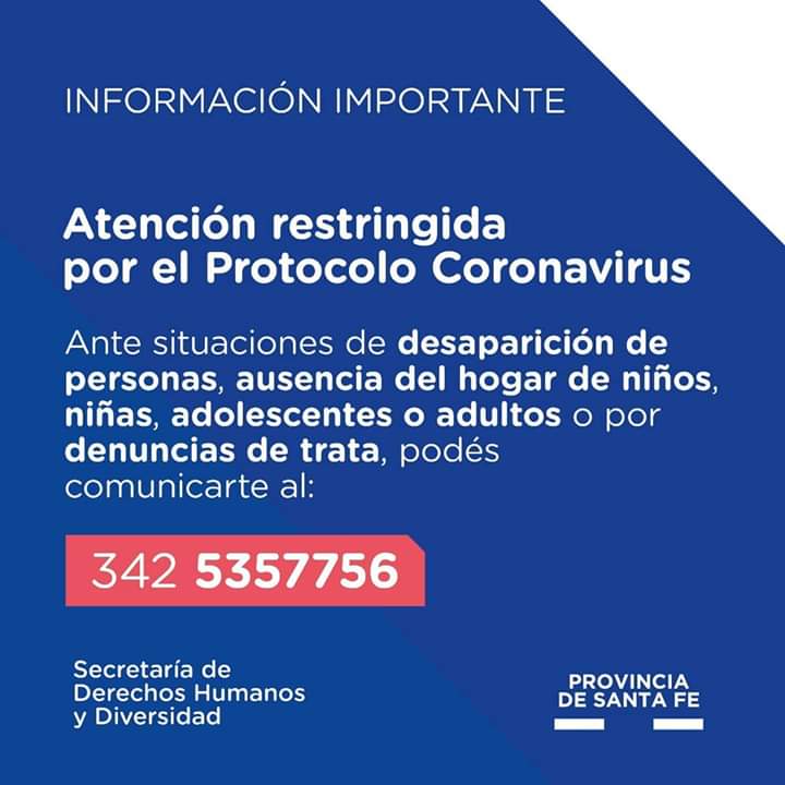 El número es 3425357756 para comunicarse ante desaparición de personas, ausencia del hogar de niños, niñas, adolescentes o adultos y denuncia de trata, ante la atención restringida por protocolo de coronavirus.
