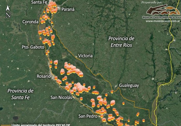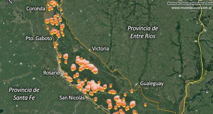 En los últimos siete días hubo 2820 focos de calor en el Delta del Río Paraná, lo que incluye también al Río Coronda, tal como se observa en el mapa confeccionado con imágenes satelitales de la Nasa y publicado por el Museo de Ciencias Naturales de San Nicolás.
