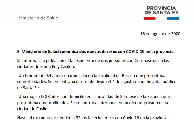 El Ministerio de Salud de la Provincia de Santa Fe informó el fallecimiento de dos personas con coronavirus en las ciudades de Santa Fe y Casilda.