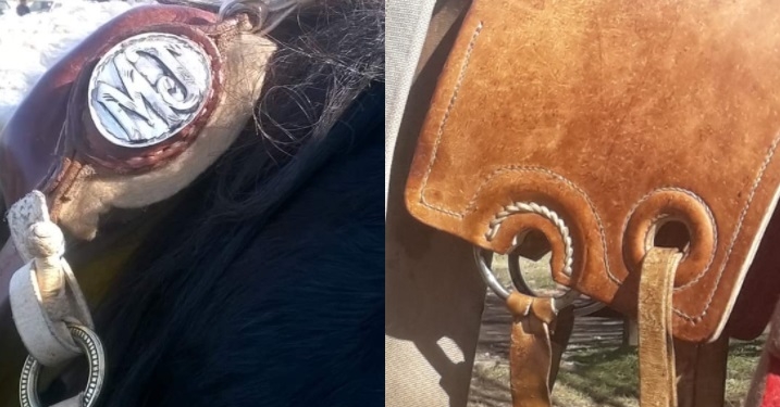 De uno de los recados fue robado un basto de cuero marrón con la encimera, estribo de cuero marrón, (es un estribo pata de gallo), estribera color crudo, pegual y cabezada trenzada.