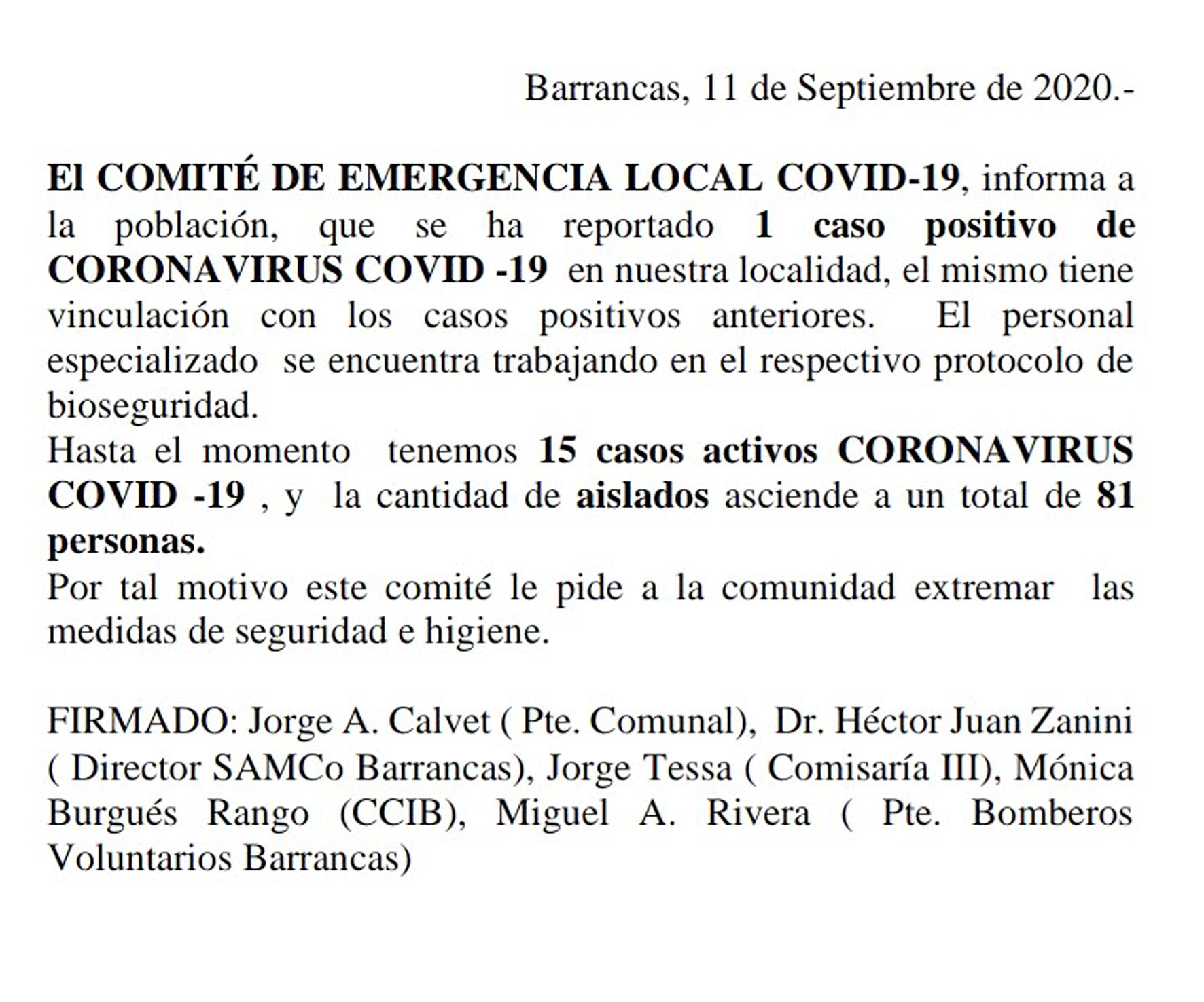 «Hasta el momento tenemos 15 casos activos de coronavirus COVID-19 y la cantidad de aislados asciende a un total de 81», indica el comunicado oficial. El comité pide a la comunidad extremar las medidas de seguridad e higiene.