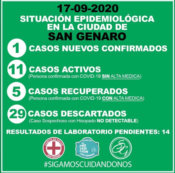 La situación epidemiológica en San Genaro refiere un total de 11 casos activos hasta la fecha y 5 recuperados. Además se espera por 14 resultados pendientes.
