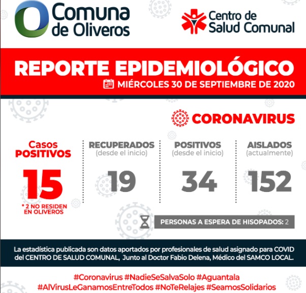 En parte epidemiológico anunció que al día de la fecha se cuentan 15 casos positivos en la localidad, dos de los cuales no residen en ella. Además, 152 personas se encuentran aisladas en sus domicilios.