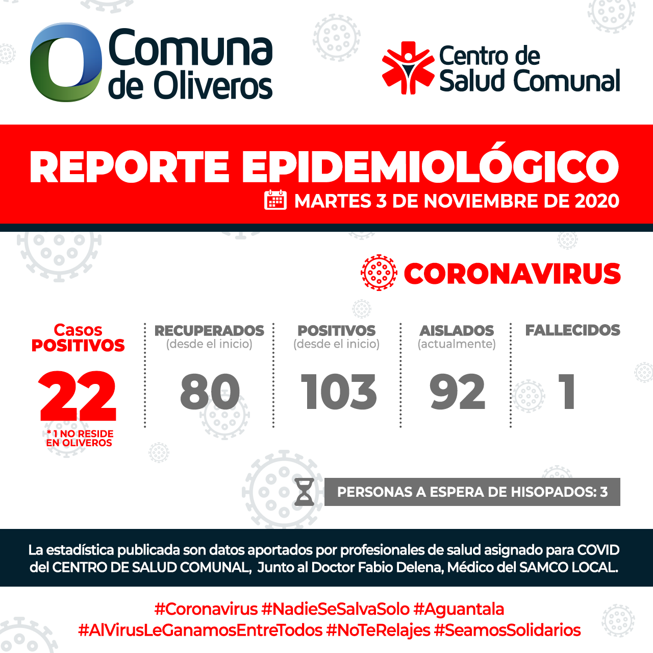 En total, son 103 las personas que dieron positivo, de las cuales 22 se encuentran transitando la enfermedad, 80 ya recibieron el alta epidemiológica y se registró un fallecido días atrás.