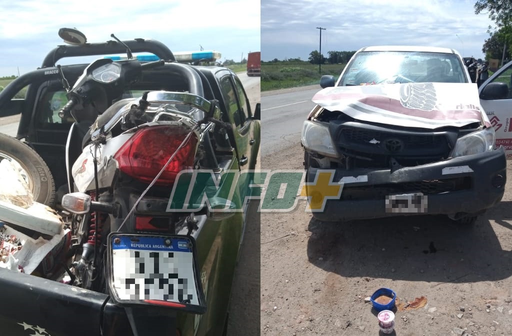 Una camioneta de la empresa Prialis y una moto impactaron en la localidad de Timbúes. El conductor de la empresa macielense se encuentra en buen estado de salud mientras que quien viajaba en el birrodado fue trasladado con heridas a determinar.