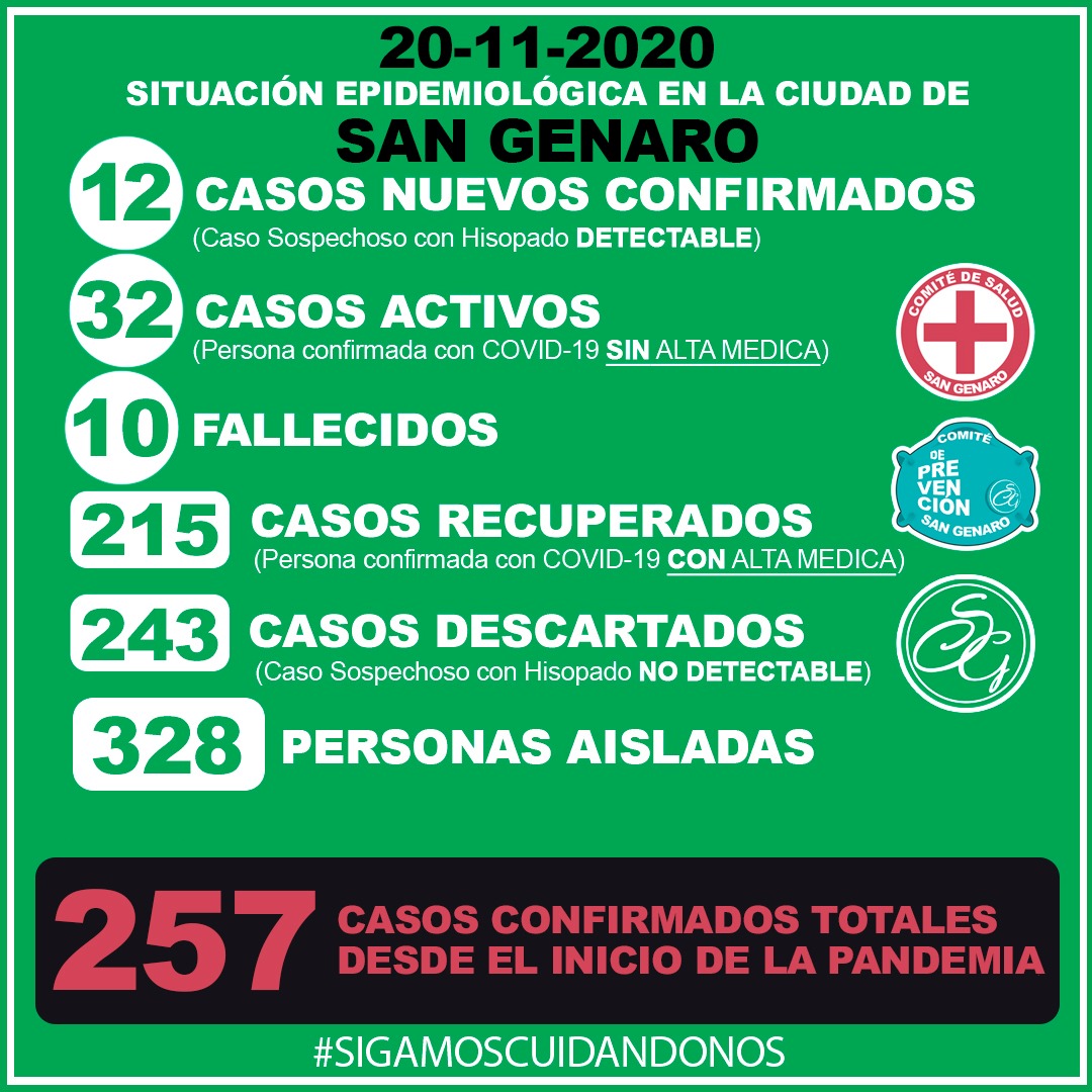 El nuevo informe epidemiológico de San Genaro confirmó un total de 12 casos nuevos y cinco recuperados después del último parte que fue emitido el pasado miércoles.