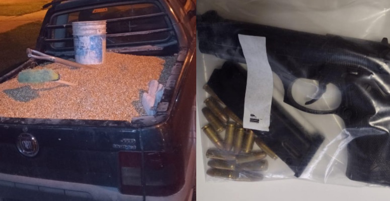 La misma contaba con un cargador municionado con 15 cartuchos cal 9mm intactos, marca FLB. También se procedió al secuestro de la camioneta Fiar Strada la cual contenía en la parte de la caja de carga, varios kilos de cereal, más precisamente Maíz, desconociendo la cantidad en kilaje, una pala ancha, un cepillo de barrer y un balde de 20 litros.